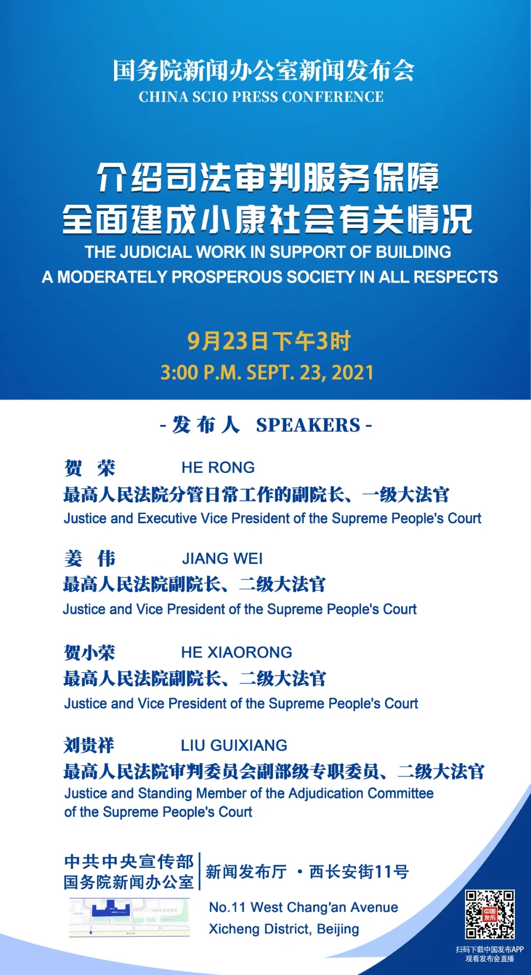 国务院新闻办公室定于2021年9月23日下午3时举行新闻发布会,请最高人民法院相关负责人介绍司法审判服务保障全面建成小康社会有关情况。敬请关注!