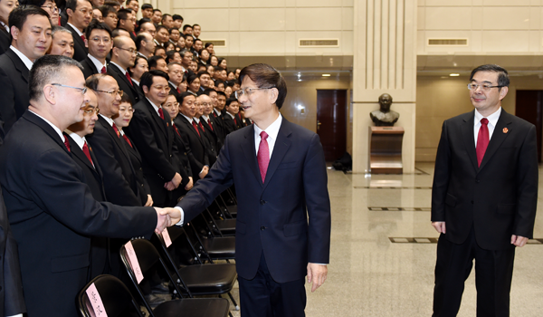 12月25日,中共中央政治局委员、中央政法委书记孟建柱在北京会见最高人民法院六个巡回法庭的全体法官和工作人员。郝帆摄