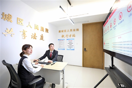 温州市鹿城区人民法院执行法官在共享法庭执行e站与站长对接工作。