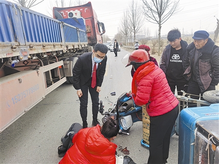 近日,山东省沂南县人民法院蒲汪人民法庭法官助理朱怡飞、书记员张祥泰在前往湖头镇调解案件的途中,目睹了一起交通事故。1辆卡车与1辆三轮车相撞,三轮车变形严重,1位老人满脸是血地躺在地上动弹不得。事发路段属于乡村之间的必经之路,来往车辆较多,加之围观群众聚集,交通堵塞,情况紧急。