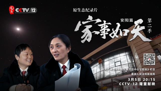 最高人民法院新闻局与中央广播电视总台社教节目中心《现场》栏目联合出品,首部记录家事审判工作的原生态法治纪录片《家事如天(第二季)》正式推出。2022年3月5日20:05,CCTV-12,《家事如天(第二季)》安阳篇即将与您见面。
