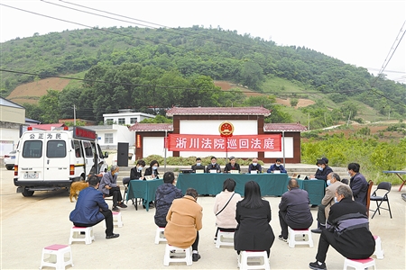 2022年5月13日,河南省淅川县人民法院民一庭法官来到位于南水北调中线工程水源地涵养区的寺湾镇老庙村,巡回审理一起林业承包合同纠纷案。 张长海 摄