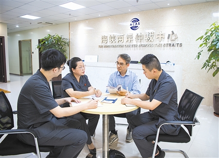 图为平潭法院干警与海峡两岸仲裁中心工作人员及台胞仲裁员就涉台案件中法律适用问题进行交流。林 泳 摄