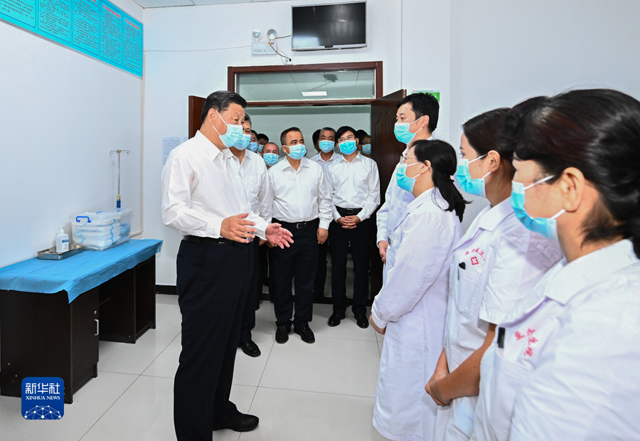 7月12日至15日,中共中央总书记、国家主席、中央军委主席习近平在新疆考察。这是14日,习近平在吐鲁番市高昌区亚尔镇新城片区新城西门村党群服务中心医务室考察。新华社记者燕雁 摄