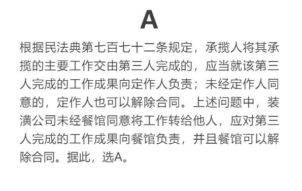 A.因装潢公司将装修任务交给了另一家公司负责,故装潢公司应对该家装潢公司完成的工作成果向餐馆负责。因装潢公司转让工作任务,并未征得餐馆同意,餐馆可以解除合同;