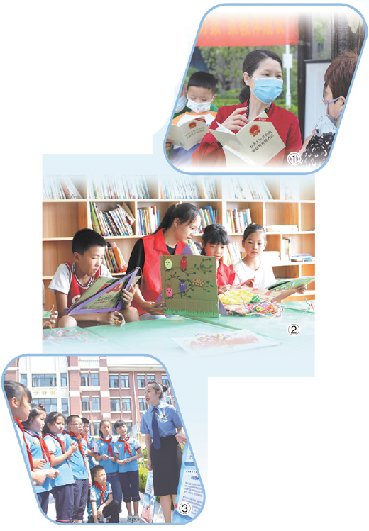 图③:山东省高密市经济开发区小学,学生在听检察官讲解未成年人保护法的相关知识。