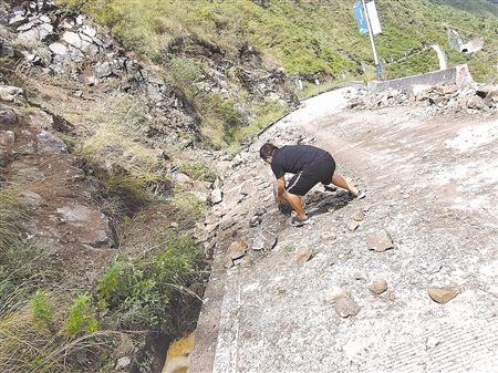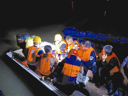 图⑤:公路垮塌,石棉法院应急分队人员乘坐小艇奔赴王岗坪乡。