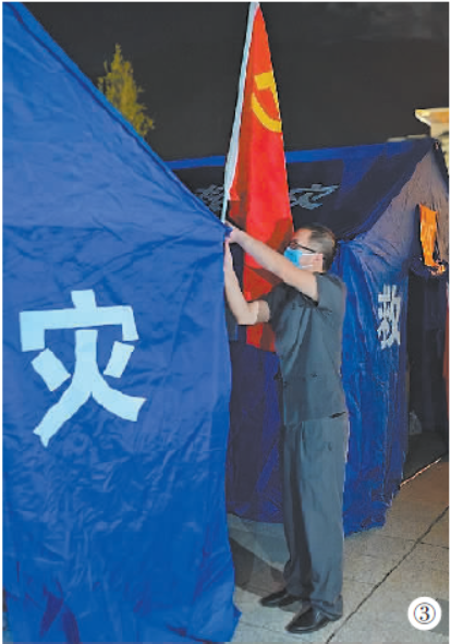 图③:石棉法院法官在安置点协助搭建帐篷。