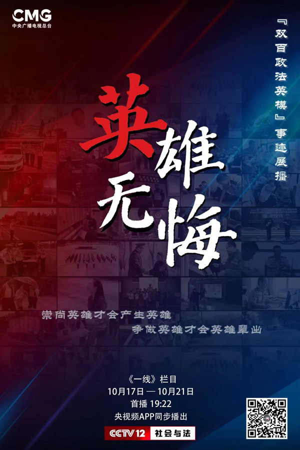 为了庆祝党的二十大胜利召开,由中央政法委宣传教育局指导,最高人民法院、最高人民检察院、公安部、司法部等有关部门支持,中央广播电视总台社教节目中心摄制的十集人物专题片《英雄无悔》于2022年10月17日-21日,在总台央视社会与法频道(CCTV-12)《一线》栏目播出。