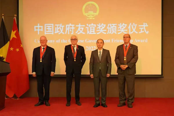 当地时间11月10日,中华人民共和国驻比利时王国大使馆举行2022年度中国政府友谊奖颁奖活动。中国驻比利时大使曹忠明主持活动,向最高人民法院国际商事专家委员会专家委员、比利时根特大学国际法教授约翰•阿奇尔•埃劳等三位比利时专家颁发中国政府友谊奖证书和奖章。中华人民共和国二级大法官、最高人民法院副院长陶凯元以视频方式向埃劳教授表示祝贺。