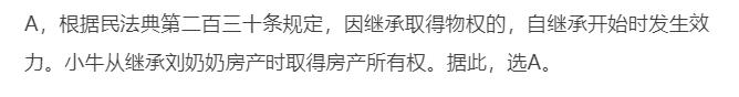 刘奶奶因病去世,名下的房产由小牛继承,关于小牛何时取得房产权,说法正确的是()