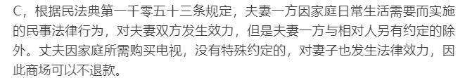 C. 不退,丈夫买电视系家庭日常生活需要,对妻子也发生法律效力;