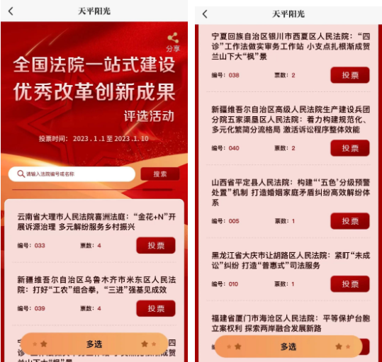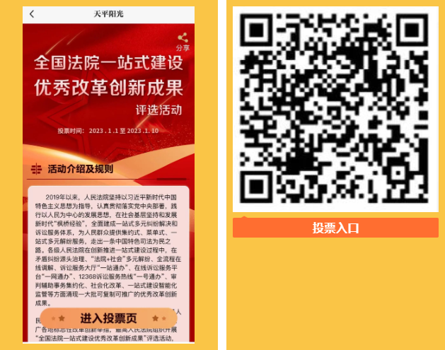 投票时间为2023年1月1日至2023年1月10日。网友可下载天平阳光App每次最多可以选10部作品,每天限投10次。最终投票结果将作为入选“全国法院一站式建设优秀改革创新成果”的重要参考。