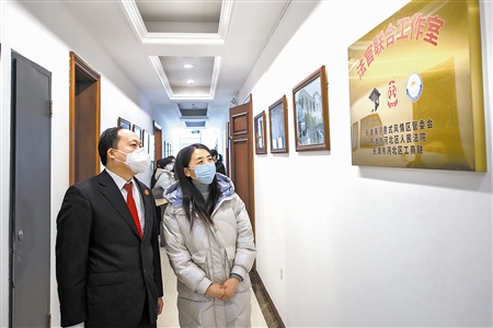 图为2023年1月6日,全国人大代表郭红静到天津市河北区人民法院驻意风区法官联合工作室参观视察。李凤津 摄