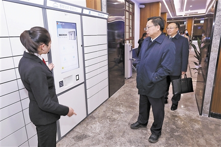 图为曹清尧(左二)参观重庆破产法庭诉讼服务中心智能云柜系统。尚 博 摄