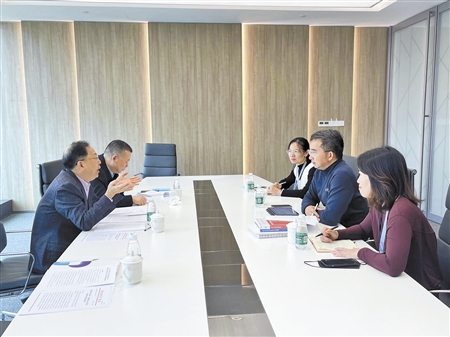 图为2月8日,全国人大代表袁玉宇(右二)与广州知识产权法院院长洪适权(左一)在“专精特新”企业迈普医学公司座谈交流海外知识产权维权体系建设工作。侯 洁 摄
