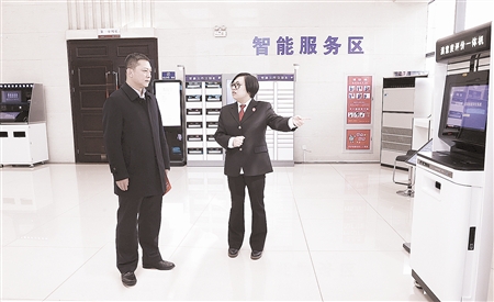 图为杨震生(左)参观唐山中院诉讼服务中心。 马 超 摄