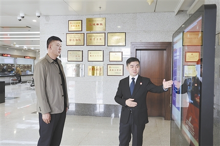 图为佛山中院诉讼服务中心工作人员为孙建国(左)讲解便民服务一体机功能。杨 昊 摄