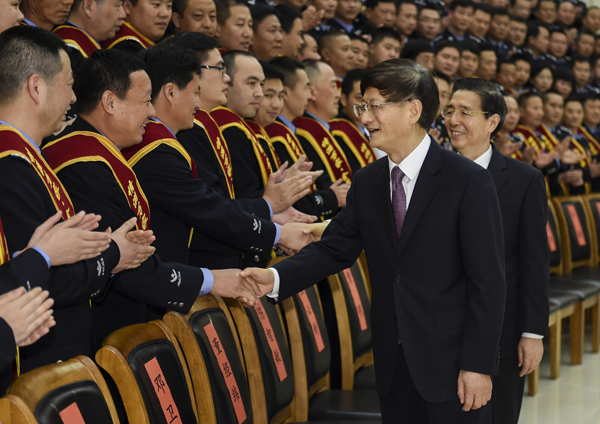 中共中央政治局委员、中央政法委书记孟建柱会见获奖代表。郝帆 摄