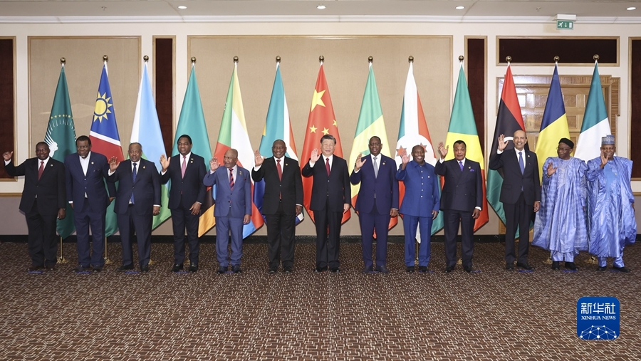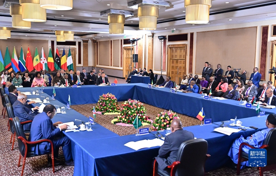 非盟轮值主席、科摩罗总统阿扎利,中非合作论坛非方共同主席国、塞内加尔总统萨勒,非洲次区域组织代表赞比亚总统希奇莱马、布隆迪总统恩达伊施米耶、吉布提总统盖莱、刚果(布)总统萨苏、纳米比亚总统根哥布、乍得总理凯布扎博、利比亚总统委员会副主席库尼、尼日利亚副总统谢蒂马,以及非盟委员会代表穆昌加等出席。新华社记者 翟健岚 摄