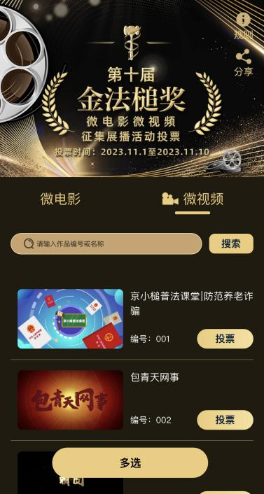 2023年11月1日,第十届“金法槌奖”微电影微视频征集展播活动投票通道开启,按照活动评审规则及流程,活动组委会对征集到的作品初评后,推荐62部微电影、90部微视频进行网络投票。