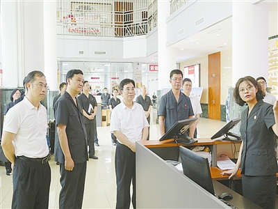 二○二三年五月十九日,广西壮族自治区高级人民法院党组书记、院长黄海龙在南宁市江南区人民法院调研基层法院管辖第一审涉外民商事案件工作等情况。党若木 摄