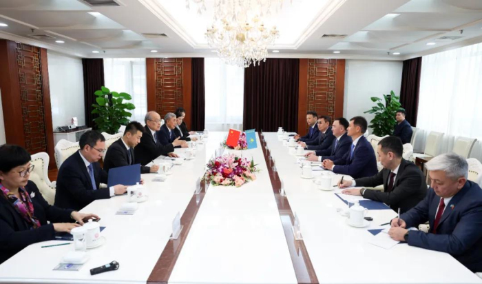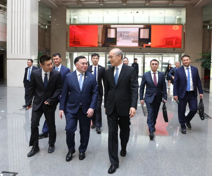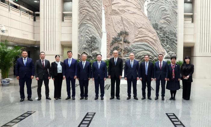 中华人民共和国二级大法官、最高法副院长杨万明,哈萨克斯坦驻华大使沙赫拉特·努雷舍夫,哈萨克斯坦驻华使馆参赞叶尔多斯·特巴耶夫,中国最高法、哈萨克斯坦法院有关人员参加会见。(记者:白龙飞 | 摄影:孙若丰)