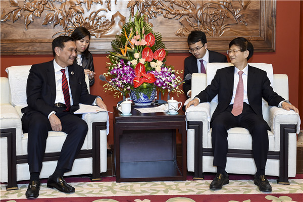 5月16日,中共中央政治局委员、中央政法委书记孟建柱在北京会见印尼海洋统筹部长卢胡特。郝帆 摄