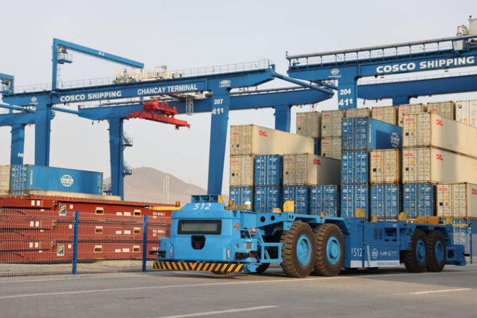 2024年11月14日,在秘鲁首都利马以北的钱凯港,岸边智能化设备吊装集装箱。新华社记者 李梦馨 摄