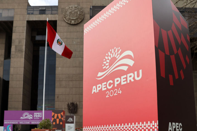 这是2024年11月10日在秘鲁首都利马拍摄的2024年亚太经合组织会议标识。新华社记者 李木子 摄