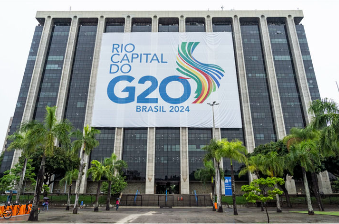 这是2024年11月16日在巴西里约热内卢市政府行政中心外拍摄的二十国集团领导人峰会标识。新华社记者 王天聪 摄