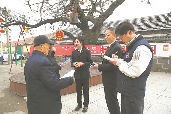 农历腊月二十七,山东省栖霞市桃村镇大楚留村年味正浓。村中600余年的古槐树上,挂满了红灯笼和中国结。树下,一条“普法进果园‘苹’安过大年”的横幅,吸引了许多果农驻足围观。