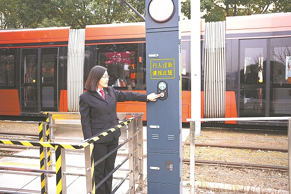 “你看,人行通道和换乘通道的提醒信号装置都是新的,乘客穿越地面轨道换乘时,先按下按钮,屏幕绿色信号亮起即可通行。”沈平按下过街按钮,此时一辆有轨电车正迎面向站台驶来,信号装置发出红色鸣音警告。