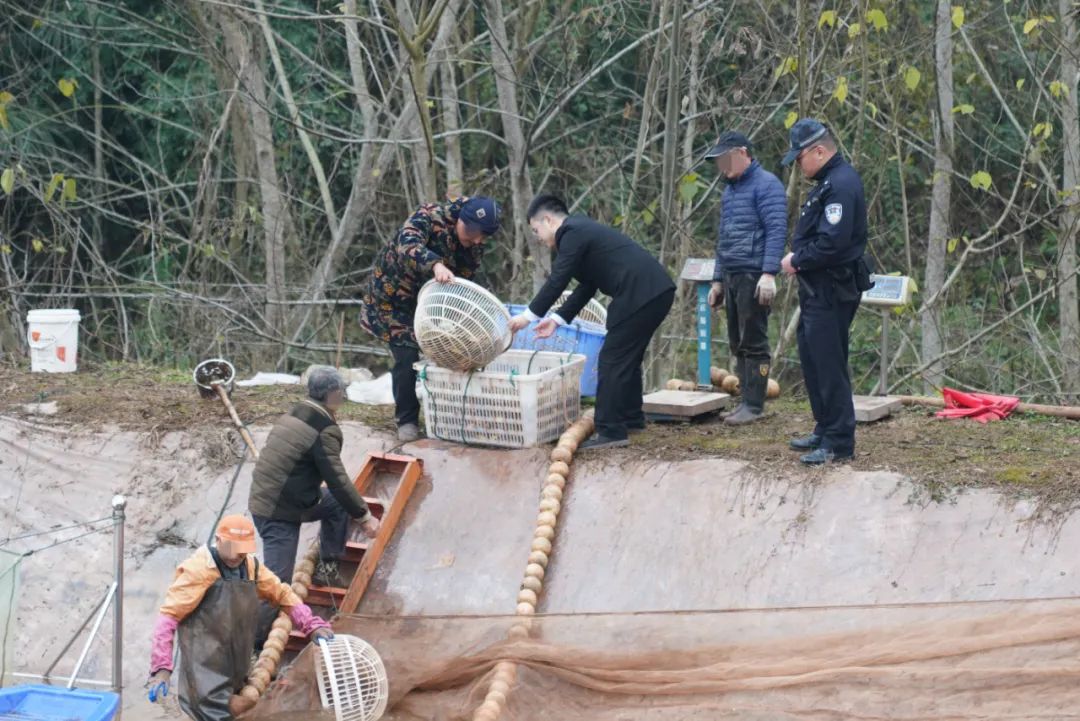 春节前夕,重庆市潼南区人民法院执行干警来到位于潼南区太安镇蛇形村的鱼塘,有条不紊地组织工人们捕捞、称重、搬运、装车,现场一派热火朝天。