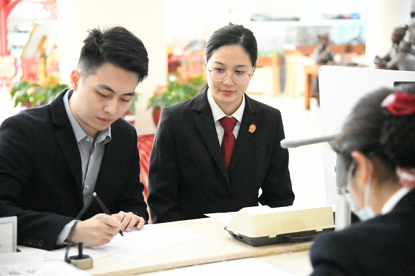 图为法官助理和破产管理人共同到银行办理转账业务。黄祝源 摄