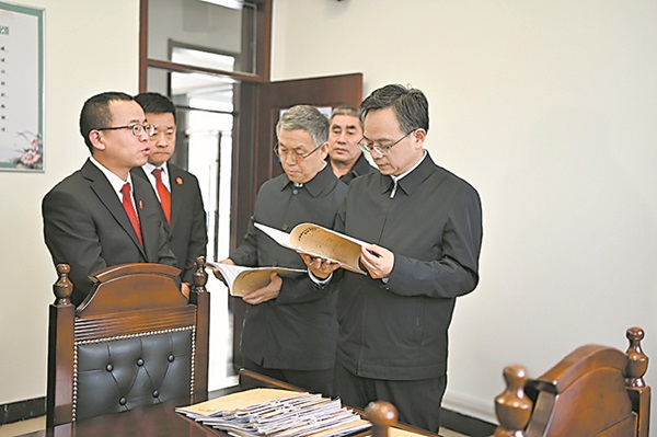 图为山西省高级人民法院党组书记、院长冯军(右一)来到韩旭辉曾经工作的长治市潞州区人民法院马厂人民法庭调研。任路 摄