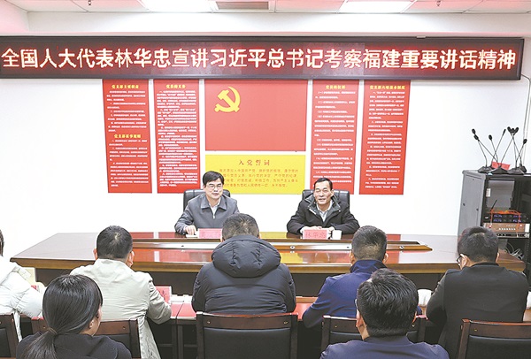 图为全国人大代表林华忠(右)走进东山法院,宣讲习近平总书记考察福建时的重要讲话精神。林淑艺 摄