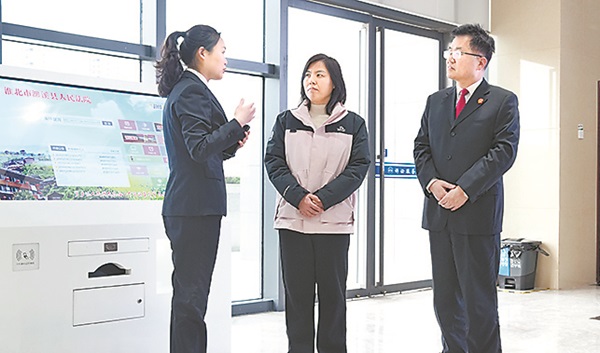 图为全国人大代表陈影(中)考察濉溪法院诉讼服务中心。
