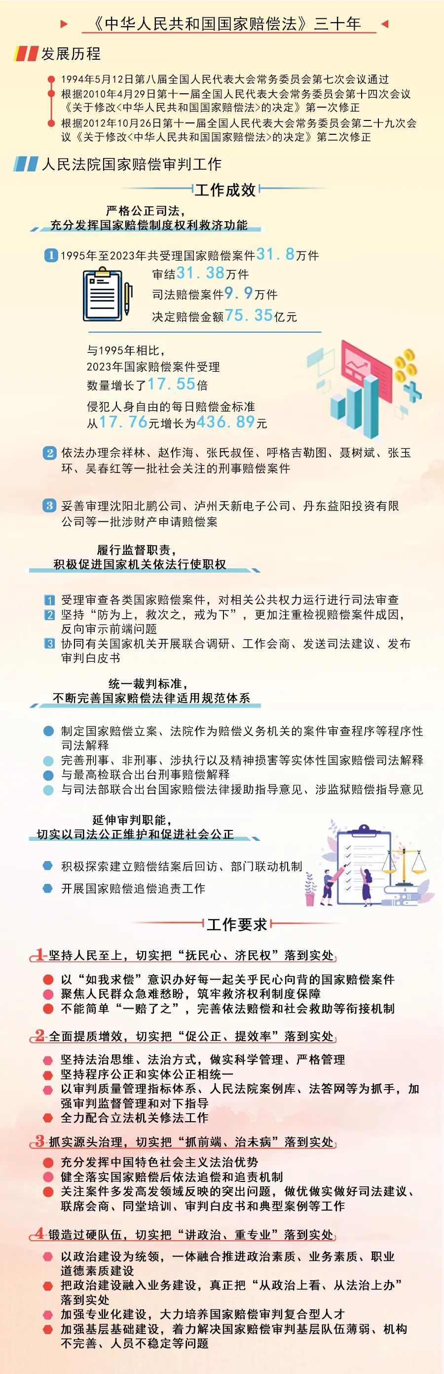 2024年是国家赔偿法颁布30周年。这部法律的实施,在保障公民、法人和其他组织合法权益,促进国家机关依法行政、公正司法,缓解社会矛盾,维护社会稳定,加强产权平等保护等方面,发挥了不可替代的重要作用。为迎2025年全国两会,展法院风采,本报今日特推出国家赔偿审判工作30年巡礼专版,敬请关注。
