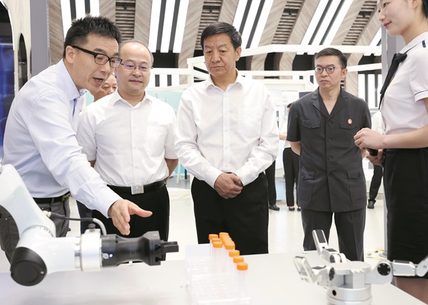 图为上海市高级人民法院党组书记、院长贾宇(右三)走访张江机器人谷,在浦东新区开展实地调研。周婧 摄