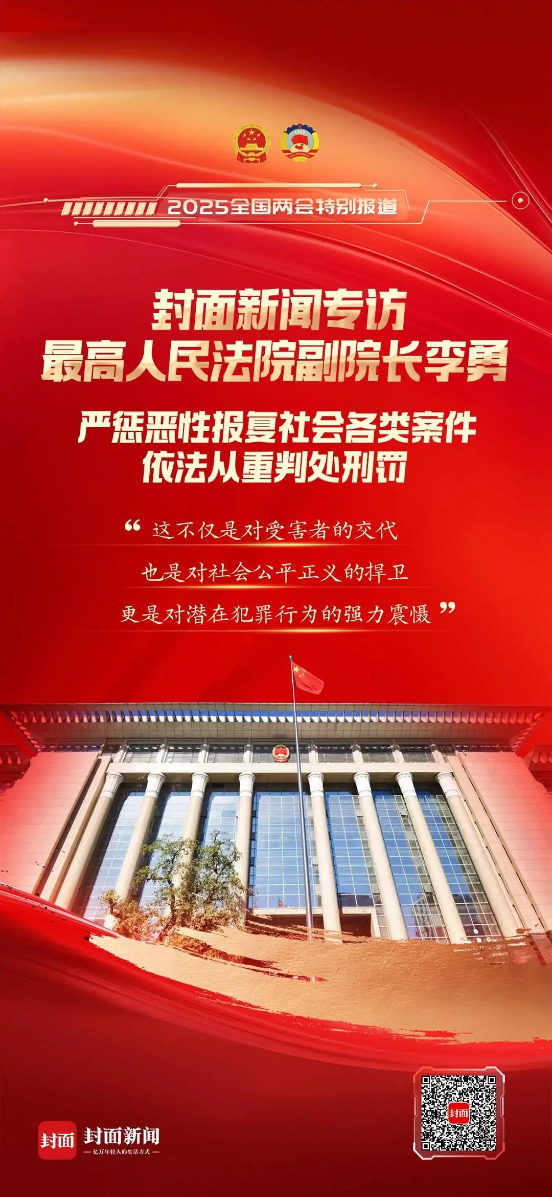 今年全国两会期间,封面新闻记者专访最高人民法院副院长李勇,他表示精准贯彻宽严相济刑事政策,依法严惩恶性报复社会各类型案件,强化警示震慑,坚持严格依法办案,确保案件办理经得起历史和法律的检验。