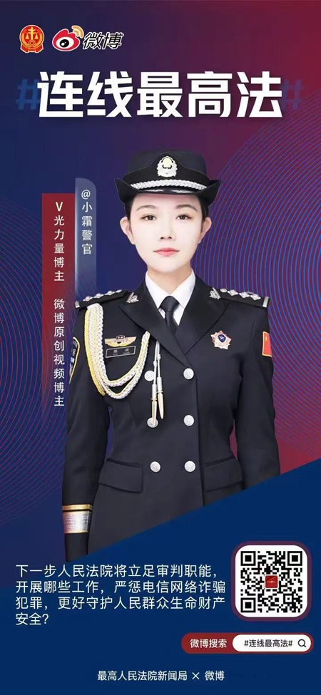 在本次活动的“连线最高法”环节,@小霜警官就打击电诈话题进行了提问。