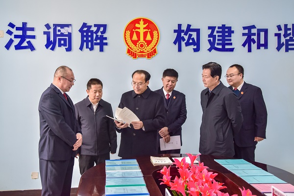 图为2024年12月6日,甘肃省高级人民法院党组书记、院长王中明(左三)在平凉市中级人民法院调研。 冯堃 摄