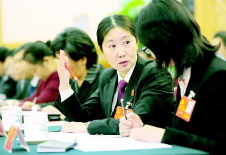 在江苏代表团分组讨论中,江苏省靖江市人民法院副院长陈燕萍代表与其他代表交流对十八大报告中关于司法改革内容的认识和体会。 记者 居 杨摄