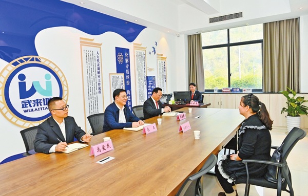 3月26日,湖南省高级人民法院党组书记、院长朱玉(左二)在张家界市武陵源区人民法院“武来调”调解工作室接待来访群众。庹兴亮 摄