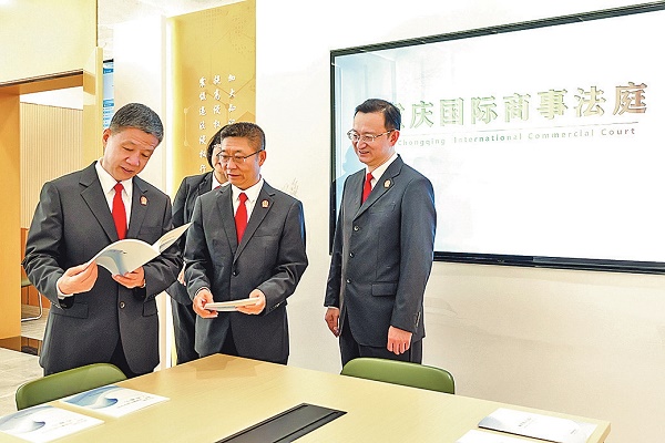 图为4月29日,重庆高院党组书记、院长李永利(左一)调研重庆国际商事法庭。吴川娇 摄