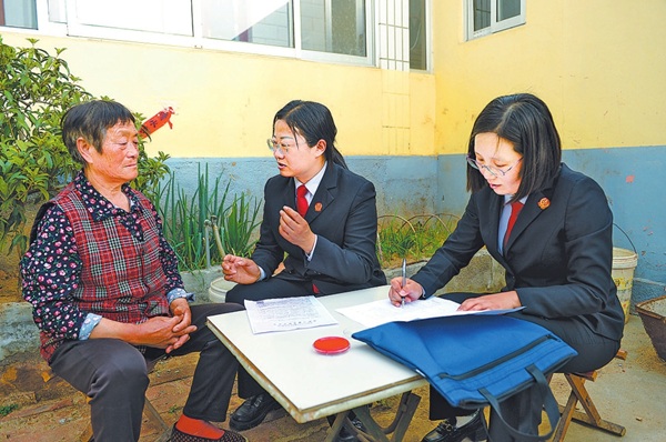 图为张文梅(中)上门帮助填写要素式起诉状。孔静 摄