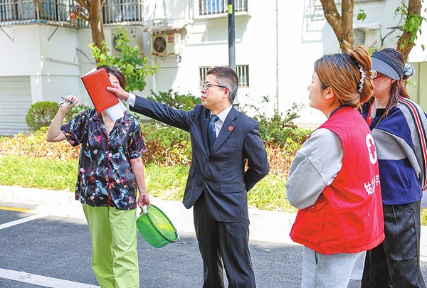 图为江苏省苏州市吴中区人民法院行政庭庭长周宏(左二)来到绣浪苑实地查看楼栋具体情况。陶萌璘 摄