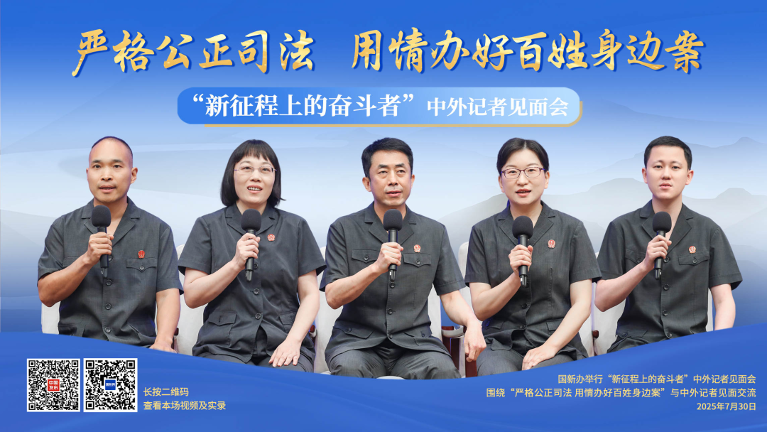 7月30日下午,国务院新闻办公室在北京举行“新征程上的奋斗者”中外记者见面会,5位来自法院系统的代表围绕“严格公正司法 用情办好百姓身边案”主题与中外记者见面交流,分享着他们在金融、互联网、知识产权等审判实践中的探索与创新,也讲述着援藏法官开展普法宣传、巡回调解的基层实践,展现着乡村振兴战略中人民法庭定分止争的时代担当。