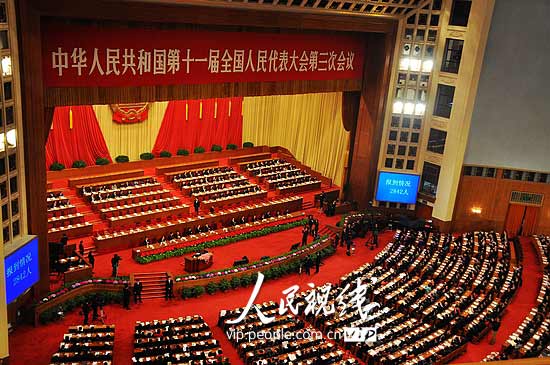 3月11日下午15时,第十一届全国人民代表大会第三次会议在人民大会堂举行第四次全体会议,听取最高人民法院院长王胜俊作最高人民法院工作报告, 图为会场全景。(图片来源:人民网)